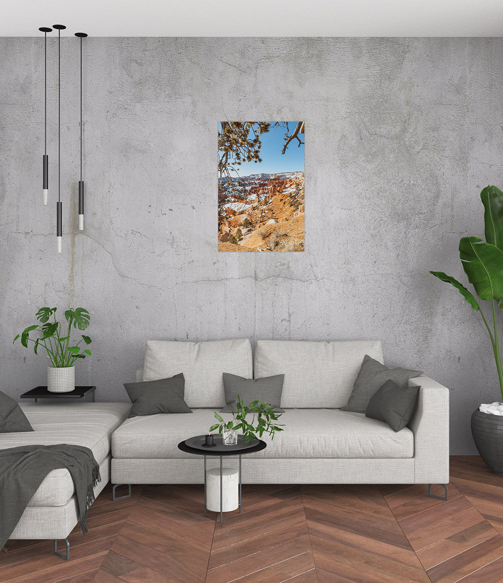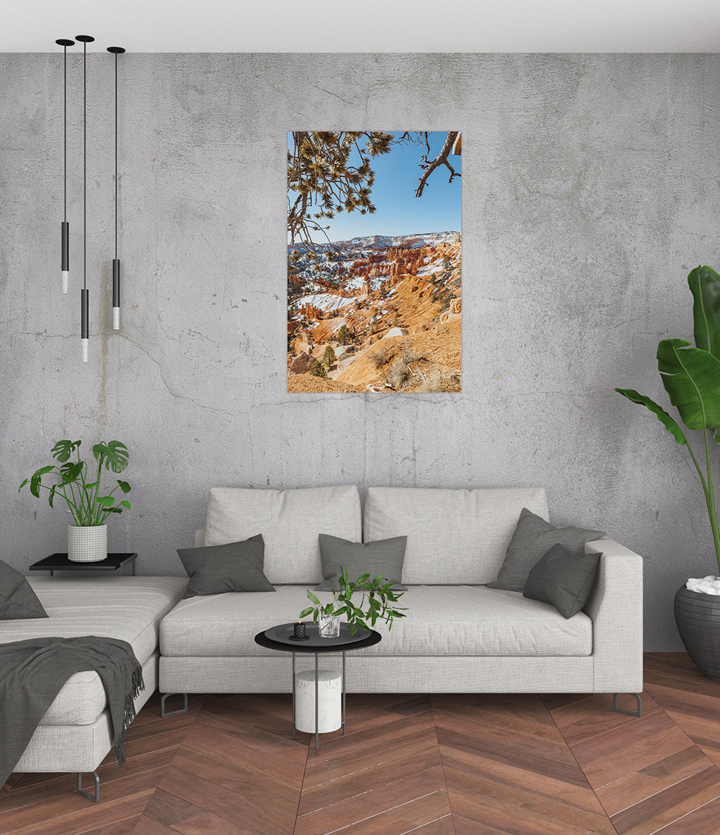 Cette photographie envoûtante offre une fenêtre naturelle sur les merveilles de Bryce Canyon, où le désert flamboyant rencontre la pureté cristalline de la neige. À travers les branches d’un pin noueux, l’image encadre parfaitement les majestueuses formations rocheuses — les célèbres hoodoos — qui s’élèvent comme des cathédrales sculptées par le vent et le temps.
